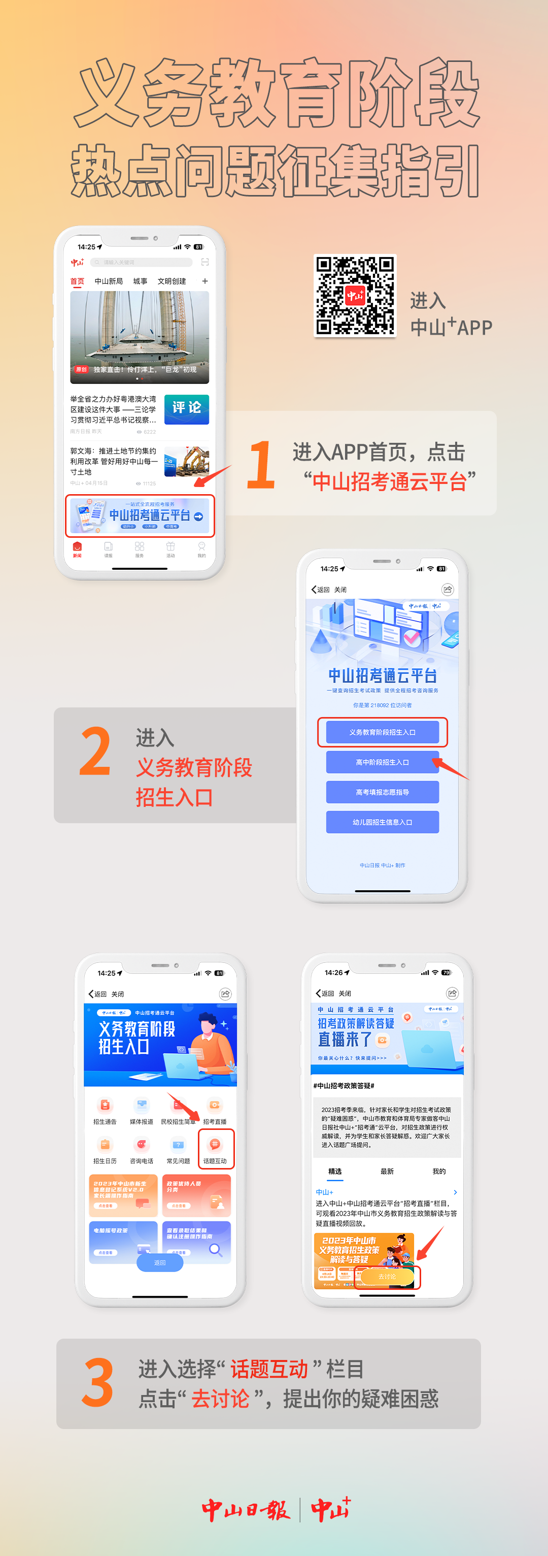 由中山日报社中山+客户端打造的中山市首个手机端招考服务平台“中山招考通云平台”将继续做好招生季服务工作,考生家长也可进入云平台,点击“义务教育阶段招生入口”,进入话题互动便可提问。
