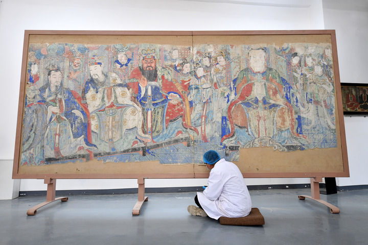 ▲在山西省大同市云冈石窟研究院壁画文物修复室,工作人员在修复壁画(2021年5月9日摄)。新华社记者 詹彦 摄