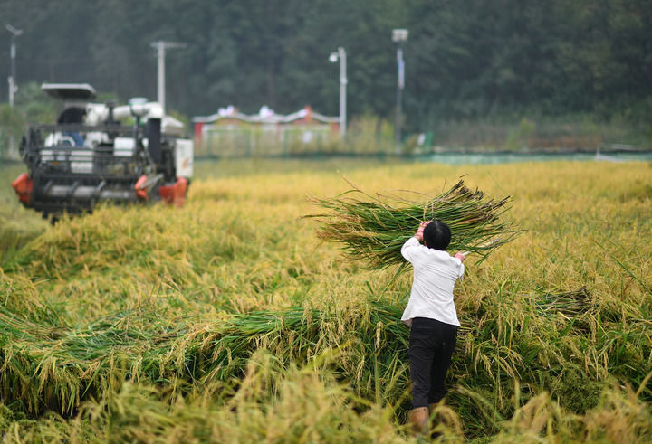 ▲在陕西省汉中市洋县龙亭镇一处稻渔综合种养基地,农民在收割水稻(2022年9月15日摄)。新华社记者 张博文 摄