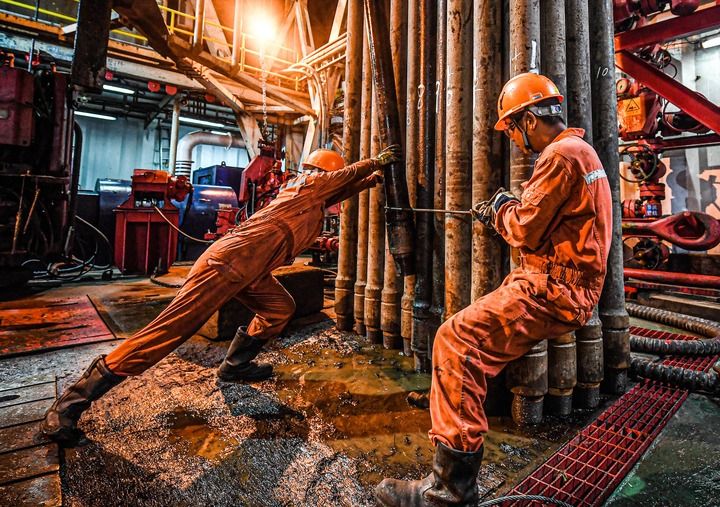 ▲在位于南海北部海域的勘探三号钻井平台上,钻井工人在摆放钻杆(2020年7月26日摄)。新华社记者 蒲晓旭 摄