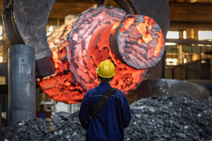 ▲在位于黑龙江省齐齐哈尔市的中国一重生产车间,工人操控吊钳吊运加热后的锻件(2023年4月18日摄)。新华社记者 谢剑飞 摄