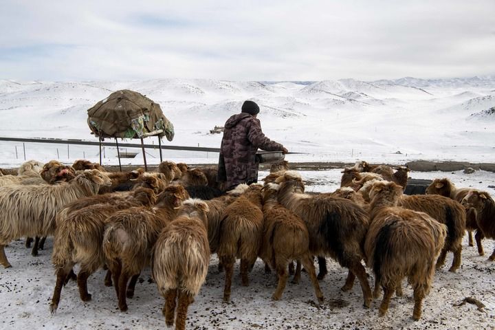 ▲在新疆裕民县巴尔鲁克山南坡牧场,年轻牧民赛孜木·哈布得拉什么给羊群喂饲料(2023年2月14日摄)。新华社记者 胡虎虎 摄