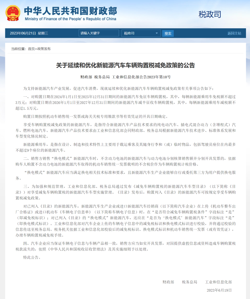 6月21日,财政部公告称,对购置日期在2024年1月1日至2025年12月31日期间的新能源汽车免征车辆购置税。具体公告内容如下: