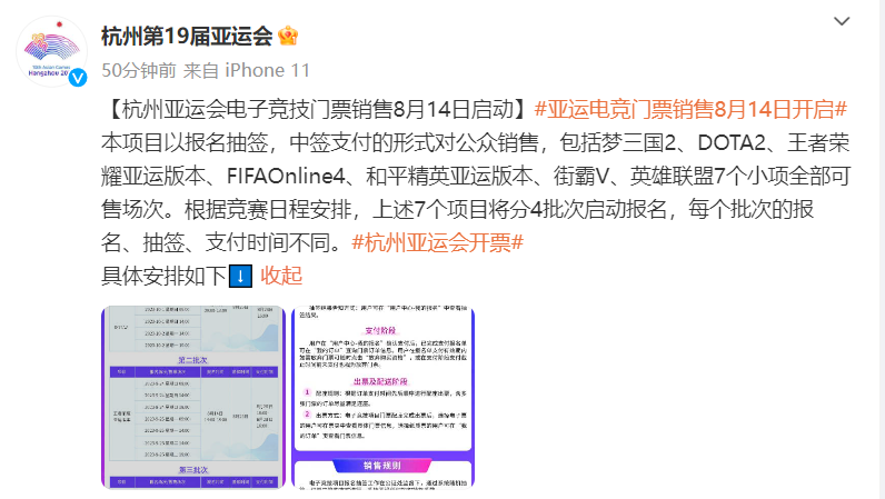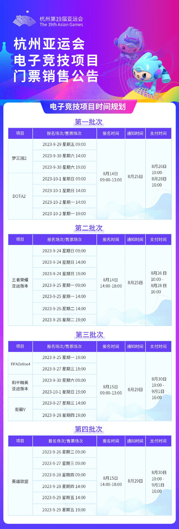 亚运电竞门票销售8月14日开启,本项目以报名抽签,中签支付的形式对公众销售,包括梦三国2、DOTA2、王者荣耀亚运版本、FIFAOnline4、和平精英亚运版本、街霸V、英雄联盟7个小项全部可售场次。根据竞赛日程安排,上述7个项目将分4批次启动报名,每个批次的报名、抽签、支付时间不同。